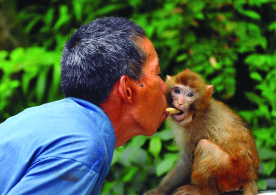 石志安在用嘴给小猕猴喂花生。