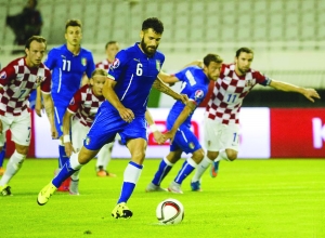 6月13日,意大利队球员坎德雷瓦(前)在比赛中主罚点球。当日,欧锦赛预选赛H组克罗地亚与意大利的比赛在斯普利特举行,双方以1比1战平。因3月在克罗地亚与挪威的比赛中,有克罗地亚球迷呼喊种族主义口号,欧足联作出处罚,当日的比赛不允许观众入场。