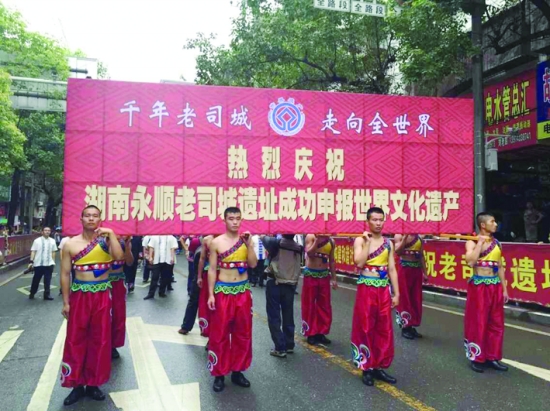 申遗成功消息传到永顺县城,群众欢庆狂欢,开始文化大巡游。 本报记者 张 谨 摄