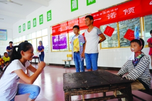 8月7日,南开大学哲学院湘西支教团在龙山县石牌小学发起了“诚以待人·信以立身”诚信话剧节,将诚信教育从课堂搬上舞台。图为学生们在表演历史话剧商鞅《立木取信》
