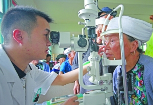 8月14日,花垣县吉卫镇,眼科医生在给老人检查眼睛。当天,湘西州“复明工程”在该镇展开,来自吉卫、排吾、补抽等乡镇131位老人参加了免费白内障筛查,共检查出54位老人符合免费白内障手术。一周后,这些老人将赴吉首享受免费手术。
