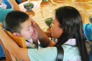 清晨的洗漱间内,孩子们都在洗脸,瘦小的欧阳斯琪拿着毛巾站在一旁不知所措。“我帮你洗吧。”小营员张真妍牵着她的手,把她拉到洗漱池旁,拿起毛巾主动帮她洗起了脸。“她不会洗,我帮她。”张真妍说。“你们谁是姐姐呀?”“她比我大,但我比她高,所以我要照顾她。”仅仅6岁半的她细心地帮7岁半的小姐姐擦起脸来。
