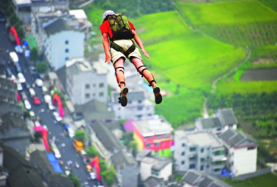 8月29日中午,来自全球的9名低空跳伞高手挑战中国低空跳伞天堂———吉首矮寨大桥,运动员从矮寨大桥上跳下,在天空中像鸟儿一样飞翔。中国选手张树鹏最终获得冠军。 本报记者 张 谨 摄