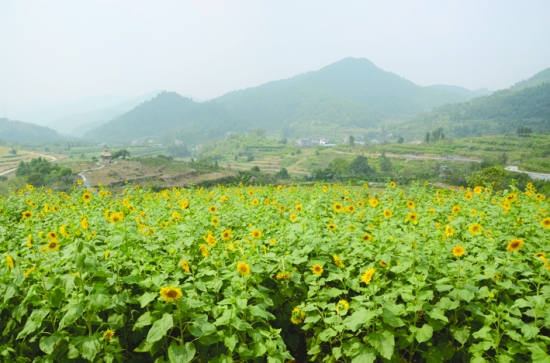 榔木村里的青山、亭子、向日葵构成了一幅别样的乡村景致。 顾勇兵 摄