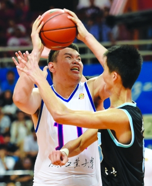 10月23日,广州工业大学队球员钟国栋(左)篮下强攻。