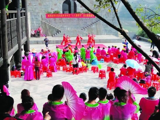 10月19日上午,吉首乾州老年宫举行庆祝重阳节文艺演出。乾州及周边老人们身着演出服装,热情演出了一个个精心排练的文艺节目,充分展示出当代老年人的风采。 记者 杨继东 摄