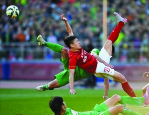 10月31日,广州恒大淘宝队球员郑龙(上前)与北京国安队球员李运秋拼抢。当日,在2015赛季中超联赛第30轮比赛中,广州恒大淘宝队客场以2比0战胜北京国安队,夺得本赛季冠军。而北京国安队球员邵佳一在当场比赛结束后正式退役。