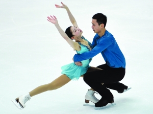 11月28日,中国选手于小雨(左)/金扬在自由滑比赛中。