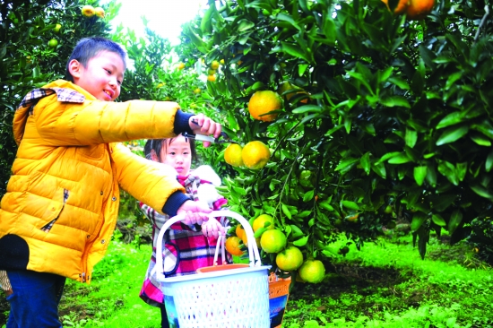 ▲小朋友们采摘橘子。 本报记者 张 谨 摄