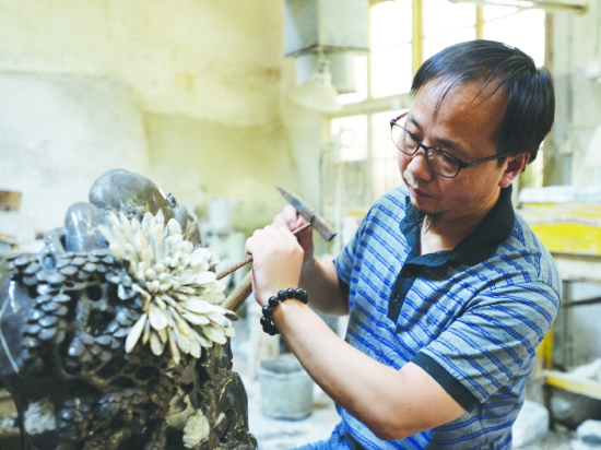 菊花石雕传人佘军正在雕刻菊花石作品。