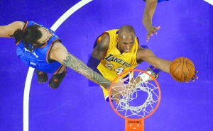 1月9日,湖人队球员科比强攻篮下。当日,NBA常规赛继续进行,湖人主场以113比117不敌雷霆,湖人遭遇三连败。