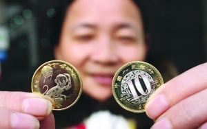 1月16日,在江苏苏州一银行网点,一名市民展示刚兑换的猴年贺岁纪念币。