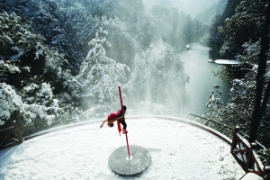 当日,著名钢管舞者金美娜携手弟子在湖南张家界武陵源宝峰湖景区上演钢管舞秀,挑战严寒,体验冰雪中的健身乐趣。