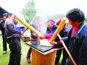文/杨秀建 上世纪八十年代,湖南湘西过年做糍粑是不可或缺的事情,只是做多做少的问题。 “二十四,舂年糍;二十五,做豆腐;二十六,分年肉……”腊月里如果哪家门前的箩筐里沥着刚淘选的糯米,谁家堂屋里传来富有节奏的“砰砰”声,那就表示这户人家正在做糍粑迎新年。糯米价钱贵,但为了能吃上糍粑,村民平常省吃俭用;糯谷产量低,但分田到户后,村民也会忍痛割爱地腾出几分水田栽种糯稻。 打糍粑是体力活也是技术活,每个细节都马虎不得。蒸糯米往往由村里一名经验丰富的中年妇女负责,火候大小,蒸煮时间长短,都要掌握得恰到好处,既要防止甑子底下小孔被糯米堵塞上不了蒸汽,还要当心锅子里的沸水回流进甑子(“上水”),否则会造成糯米蒸不熟或煮得过软的现象。 蒸好的糯米饭晶莹剔透清香扑鼻,能勾出强烈的食欲。糯米饭一出锅,就有人猴急地抓起一把在手心里边吹边捏成团,然后津津有味地吃起来。当女主人把一脸盆热气腾腾的糯米饭倒进圆形石臼,早已摩拳擦掌的两位壮劳力,提起早已浸泡在水桶里的舂杵,开始了最关键的舂糍粑环节。 舂糍粑的时候,两人面对面站着,各拿一根舂杵,先用力按压石臼里的糯米饭三五分钟,待略显松散的糯米饭紧紧粘成一团,双手紧握舂杵中偏上的位置用力冲击饭团。舂糍粑不仅力度要适中,更要讲究协调配合和落点的“稳、准、狠”。用力过猛,容易把米饭冲撒到地上;一方转动身子,另一方也跟着转动,始终保持对立的姿势;一方舂杵粘上了柔韧的糯饭,另一方及时用舂杵帮对方把糯饭剔除。 上上下下反反复复,直至糯米饭渐渐变成了韧劲十足的软糕状。这时,两位壮劳力非常默契地把舂杵狠狠舂下,他们一边使劲往下按压,一边用上下交叉的舂杵在石臼里搅拌转动,到糯米团完全缠绕在两根舂杵上时,两人同时“嗨”的一声发力,迅速挑起那柔韧绵长的糯饭团。 一位妇女马上迎上前去扶住长长的糯饭团,用一根抹了油的麻线,三下五除二地把舂杵上的软糕全部剥离下来,然后娴熟麻利地从大饭团上拧下一小坨,整齐地摆放在铺好的门板上。其他几位妇女则用涂了蜂蜡的巧手轻轻按压,随即一个个白净圆润的糍粑成型了。 看见白嫩油亮的糍粑,孩子们马上围拢过来,一人手里拿着一个糍粑吃着笑着闹着跑开了。家里的女主人,及时拿出海碗盛上冒着热气的糍粑给左邻右舍送去,让他们一起分享新年的喜悦和快乐。 过一些日子,村民把阴干的四个一摞的糍粑,又一个个掰开,然后浸泡在烧开冷却的泉水里。适时换水,浸泡得当的糍粑,来年插秧打田时都不会有一点酸腐味。 当时,哪家糍粑做得多,吃的时间长,是一件引以为豪的事情,会引来不少村民羡慕向往的眼神,于是村民们尽量节省吃,尽可能多做些糍粑,以期幸福快乐的时光能延续更长、更久。 |