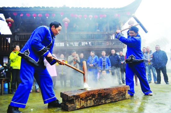 中国土家第一村———永顺县双凤村村民聚在一起,热热闹闹打年粑,欢欢喜喜过新年。 彭建国 摄