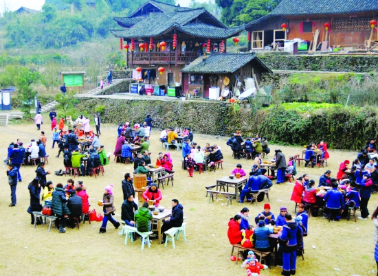 2月1日,世界文化遗产老司城遗址所在地村民汇聚在一起,杀年猪、打糍粑、推豆腐、炒炒米米、祭祖先,传承土家习俗,一起团团圆圆过赶年迎猴年。 彭建国 刘宗昂 摄