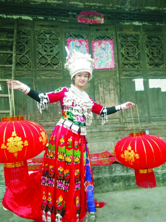 古丈县红石林镇张家坡村,一个盛装的少女准备挂起两盏红灯笼。过年了,大红的喜庆必不可少。 杨昊天 摄