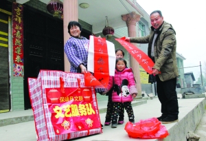 2月4日,保靖县文联服务队在清水坪镇黄连村为村民送春联。春节临近,该县文联组织30多名书法爱好者,深入各个乡镇开展“和谐春联送农家”活动,义务为村民现场书写春联,送春联,为农民送上节日的问候和祝福,受到村民们欢迎。 俞采华 陈亚平 摄