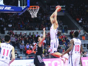 3月4日,广东东莞银行队球员易建联(上)在比赛中扣篮。