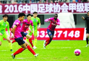 3月12日,深圳佳兆业队球员黎斐(左二)在比赛中罚进点球。