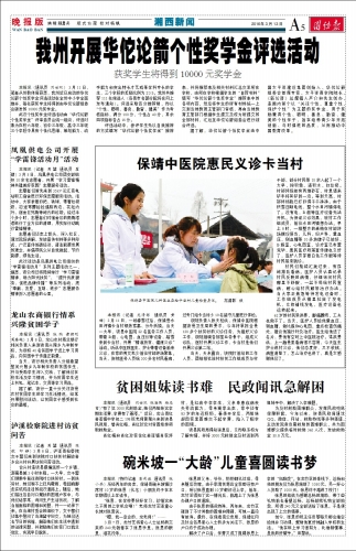 本报讯(特约记者 彭司进 通讯员 张小兵)历经两年的奔走,保靖县碗米坡镇沙湾村10岁的张恩(化名)小朋友终于在本学期得以上学读书。 “张恩,在学校要好好学习,珍惜这来之不易的上学机会啊!”老师龙竹芝语重心长地对张恩说。 “嗯,我一定会的,龙老师!”…… 3月7日,龙竹芝将爱心人士总杨转交来的240元钱塞在了张恩手里。张恩的眼里,泪花闪烁。 张恩的父亲、爷爷、奶奶都已过世,母亲随后改嫁。由于家境贫寒且全家都没有户口,所以张恩直到10岁都还没上学。前年,龙竹芝得知了这一情况后,就踏上了为张恩办理户口的道路。 由于张恩的情况特殊,两年来,龙竹芝碰到了不计其数的困难和障碍,可她一直没有放弃。最终,在保靖县公安局、保靖红网及社会各界爱心人士的多方关注下,张恩的户口终于成功办理。 解决了户口后,学费又成了阻碍张恩上学的“拦路虎”。在龙竹芝的牵线下,总杨和他的朋友们为张恩捐助了1050元,另一好心人资助了1000元,张恩终于踏进了校门! 张恩的姑姑为感谢总杨的捐助,带了些礼物前去看望总杨,总杨却把礼物全部拍卖,所得240元又全部送给了张恩。于是便出现了上文的情景。 如今,张恩的班主任田黎每天都会抽空给他补习功课,帮助他更好地融入学校的生活。“他在班上学习很努力,比谁都懂事,是我的好帮手。”田黎说。 |
