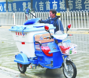 3月30日,吉首市保洁工吴师傅用电动保洁车在吉首乾州新区的街道收捡垃圾。据了解,吉首市高建公司新近购置充电式电动垃圾收集车20多台用于吉首城区保洁,有效提升了城市品位,提高了工作效率,降低了保洁工的劳动强度。