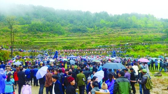 冒着大雨、四面八方的苗族同胞集聚老洞苗寨。
