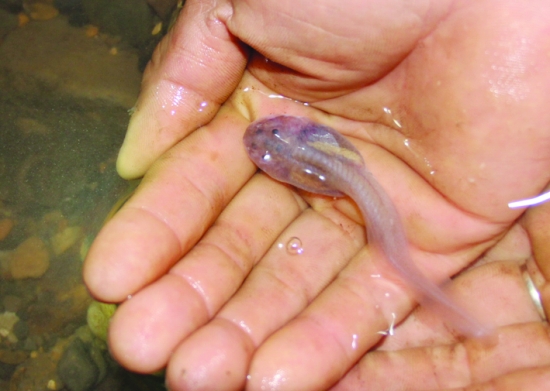 红点齿蟾的幼虫,由于长期生活在黑暗的洞穴环境中,身体成为了透明状。