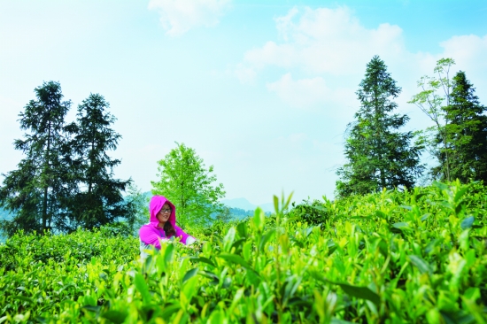 蓝天白云下,这个采茶女子为青翠的茶园带来最生动的一抹红。