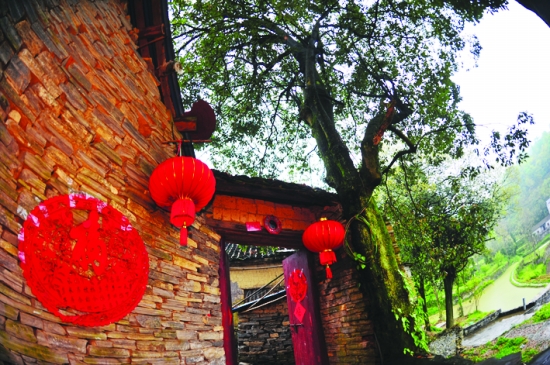 窗花贴在石墙上,别具一格。