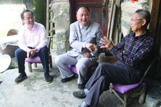 国家级邓小平特型表演艺术家,中国仿邓体书法第一人江世龙(中)在铁山采风。