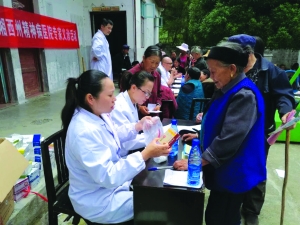5月17日,州精神病医院的医生正在给永顺县西岐乡流浪溪村村民免费发放药品。当日,州二民中、州精神病医院扶贫工作组来到扶贫村流浪溪村开展义诊下乡活动,现场为村民测量血糖、血压等,免费体检251人次,免费发药110人次,发放精神卫生健康知识宣传手册320本,并发放价值一万余元的常用综合科用药和精神科药物。