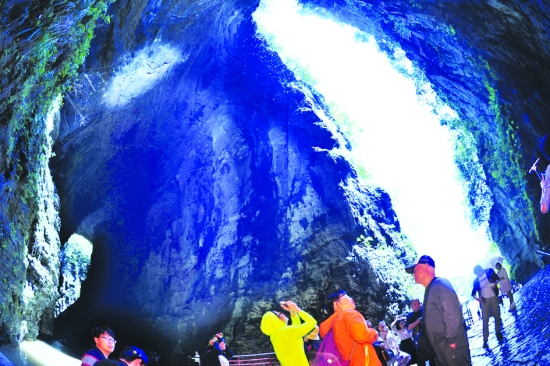 两个溶洞让巨大的山体相通,暗河在脚下流淌,空中落下的水珠让游客惊叹不已。