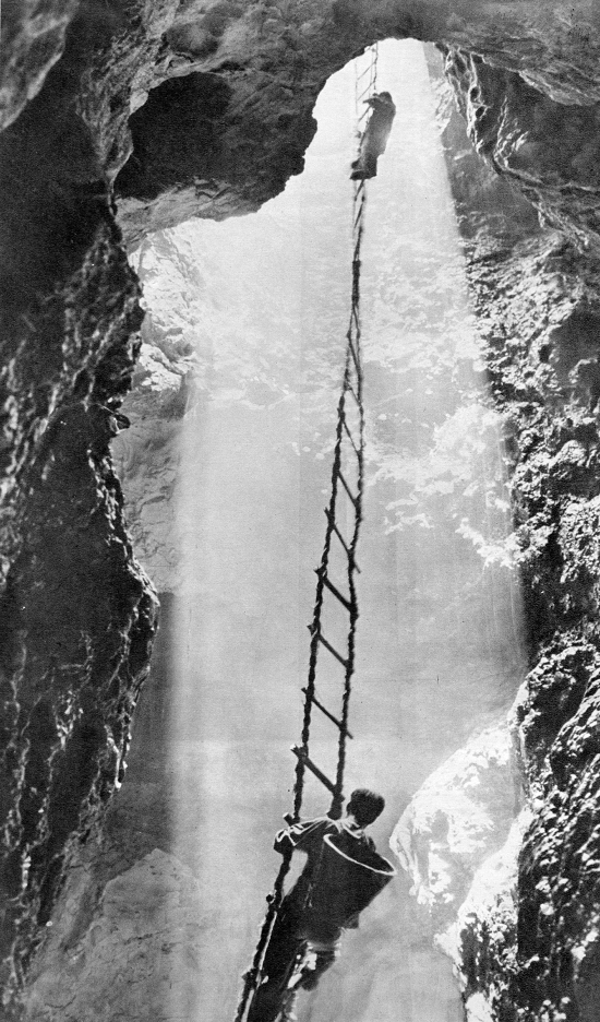 楠竹大队十八勇士通过八十一米长的软梯,将堵阴河的几百吨水泥沙石运下天坑,创造了人间奇迹。