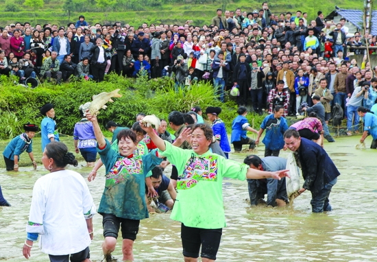 苗族妇女在进行捉稻田鱼比赛。