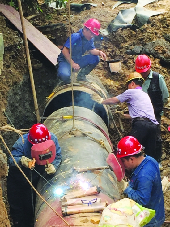 工人忙着焊接水管。