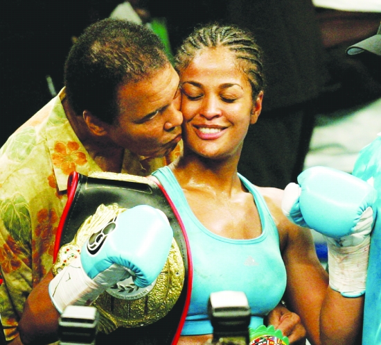 ▲ 这是阿里(左)亲吻女儿莱拉·阿里,莱拉·阿里是一名中量级拳击手(2005年6月11日摄)。 新华社/路透