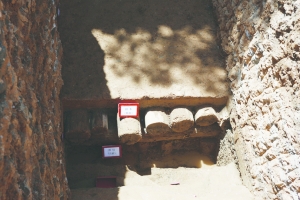 这是遗迹底部的地钉(立桩)和排木(卧桩)(6月11日摄)。
