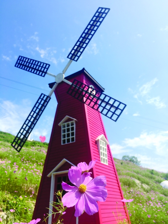 粉色的格桑花,大红的风车屋,湛蓝的天空,组成了一幅极美的自然画卷。 顾勇兵 摄