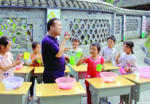 6月17日,花垣县双龙镇十八洞村,教师在指导几名“留守儿童”刷牙、洗脸和漱口。当天,该校针对“留守儿童”卫生、生活等养成习惯不够好的实际,为全校孩子购买洗漱用品,并培训洗漱技能,让孩子们健康成长。