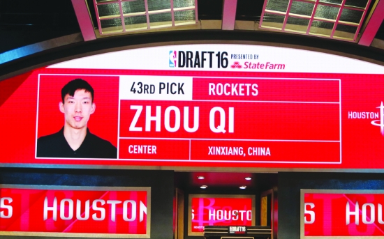 6月23日,周琦的名字、照片与火箭队队标出现在选秀大会现场的大屏幕上。 当日,在纽约举行的2016年NBA选秀大会上,中国球员周琦在次轮第43顺位被休斯敦火箭队选中。周琦本人未到现场。 新华社记者 秦 朗 摄