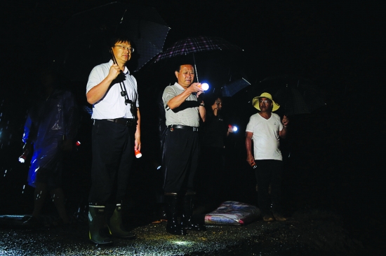 25日凌晨,叶红专(中)一行来到里耶大堤实地察看汛情。 刘 怡 摄