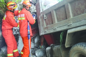 6月28日下午,凤凰县消防大队官兵正在破拆一辆事故车辆车门,为被困司机开辟救生通道。当天下午3点多,在该县吉信镇往禾库镇方向的公路上,一满载石灰的工程车撞上公路旁的岩壁上,车头严重受损,司机被卡在驾驶室。该县消防大队官兵接警后及时赶往现场,利用一辆挖掘机拉开救援空间后,立即对工程车左侧驾驶室门进行破拆,顺利救出被困司机。据被困司机介绍,工程车之所以撞到山壁上,是因为下坡途中刹车失灵。