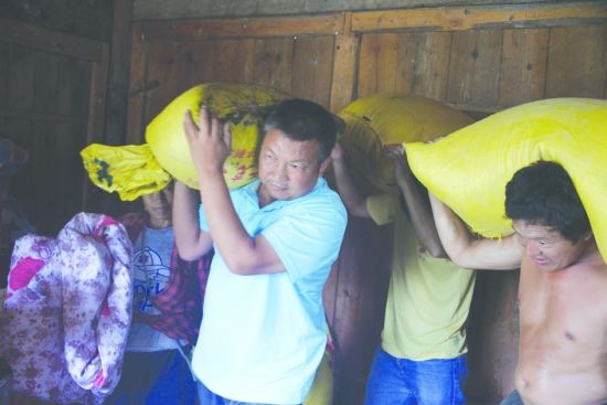 贾祖东一行帮助顾顺清、向翠萍夫妇转移粮食。