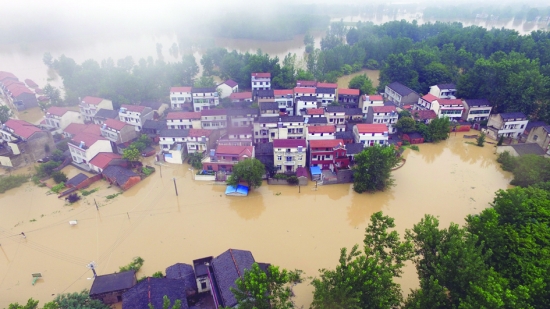 洪水淹没的村庄(7月2日摄)。 7月1日晚,湖北武汉新洲区举水河发生特大洪水,凤凰镇郑园村陶家河湾举水河西圩垸发生溃口,口门70多米,附近6个村庄、1个社区被淹。 新华社发(云豹救援队供图)