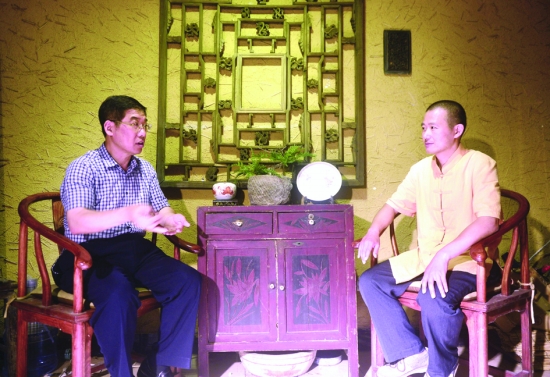 在吉首峒河花桥附近的“境然堂”,刘世树对话彭奎华。