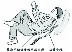 “北京瘫”这种半躺姿势最伤腰 腰椎之间有一块叫椎间盘的“弹簧片”,质软,被一个个纤维环包裹着,可以让脊柱弯曲。 半卧位时,腰椎会因缺乏足够支撑,导致原有弧度被改变,让椎间盘所受重力不断增大,诱发椎间盘突出。 若长时间处于不正确的姿势,经常受压或拉伸,“弹簧片”外的纤维环可能破裂,里面的东西就会膨出,碰到神经,引起腰臀部及下肢疼痛、麻木,即为腰椎间盘突出症。 人们常说坐下来休息,认为坐就是一种休息,但对于腰椎来说却是一个例外。 人平躺时,腰椎间盘承载的压力最小;站着时次之,此时头、躯干、上肢的重量最终传到脚弓;前倾坐位时,头、躯干和上肢的重量集中在腰椎,只有这一个孤零零的支撑点,此时腰椎间盘承载的压力最大。 因此,长期的伏案工作或不正确的坐姿很容易让人出现腰部肌肉的酸胀、疼痛。 |