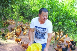 9月2日,泸溪县三妺种养殖专业合作社理事长张海正在果园林里给土鸡喂食。2013年,他在县畜牧水产局的支持下,搞起了树林下生态土鸡养殖产业,并逐步得到发展。2015年收入达40多万元,被当地赞为“ 林下养鸡大王”。今年8月,他又在省城长沙开辟了销售市场,日销售林下生态土鸡1000只以上。经测算,预计今年收入可达80余万元。 覃仁岗 摄
