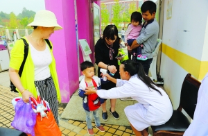 9月1日,花垣县民族幼儿园保健医生正在校门口对小朋友进行每天一次的入园健康例行检查。该园一直注重卫生保健安全教育,把孩子的安全健康放在第一位,让孩子从小养成一个良好卫生行为习惯。