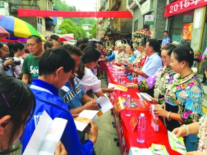 9月8日,在凤凰县山江镇,凤凰农商行员工正在向赶集的群众介绍人民币防伪技巧。当天该行共组织14名持反假币上岗证员工到该镇,开展苗汉双语反假币宣传活动,以提高农村群众反假币意识和能力,维护农村金融市场秩序。